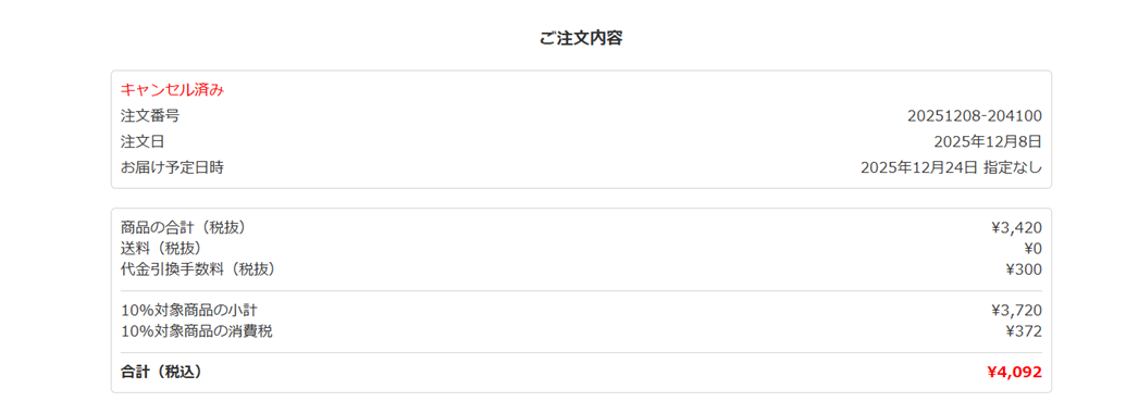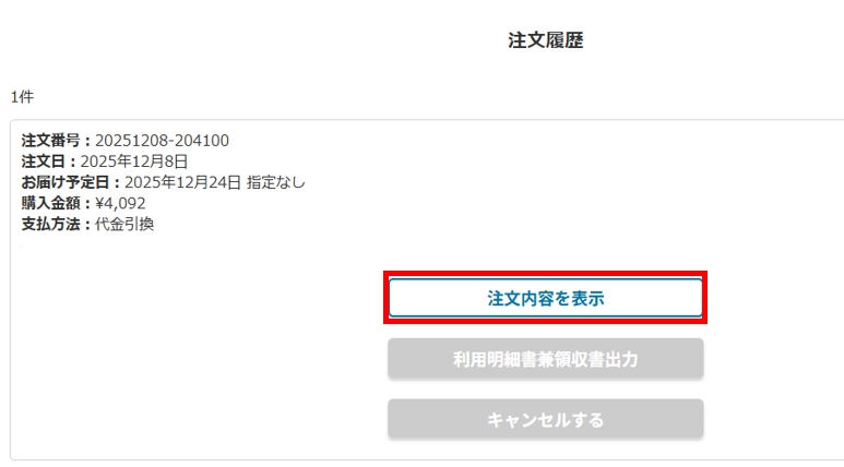 注文履歴の「注文内容を表示」ボタンを押します。